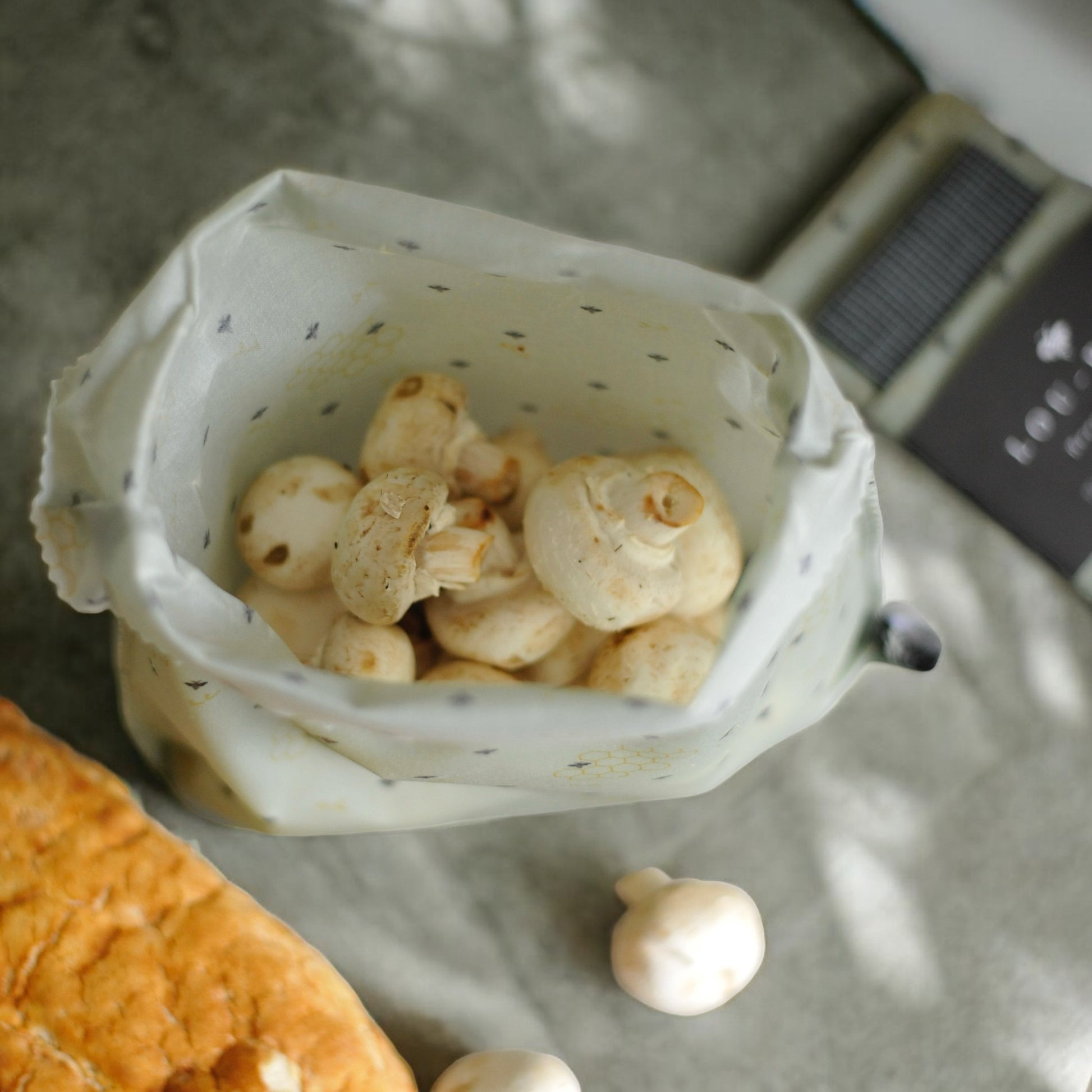Handmade with love, each bag is crafted from 100% cotton infused with our signature blend of beeswax, organic jojoba oil, and tree resin—creating a natural barrier that keeps food fresh while being kind to the planet.