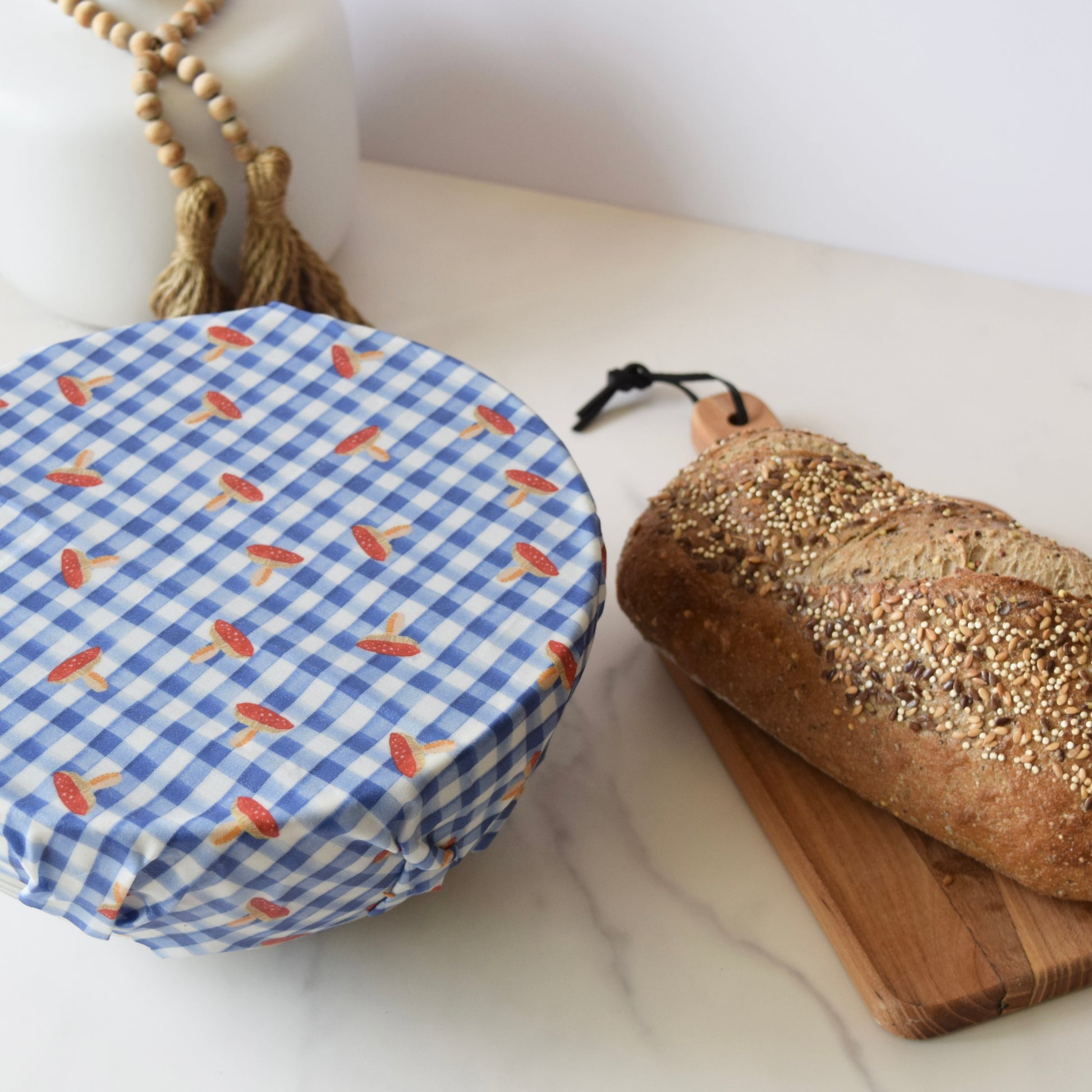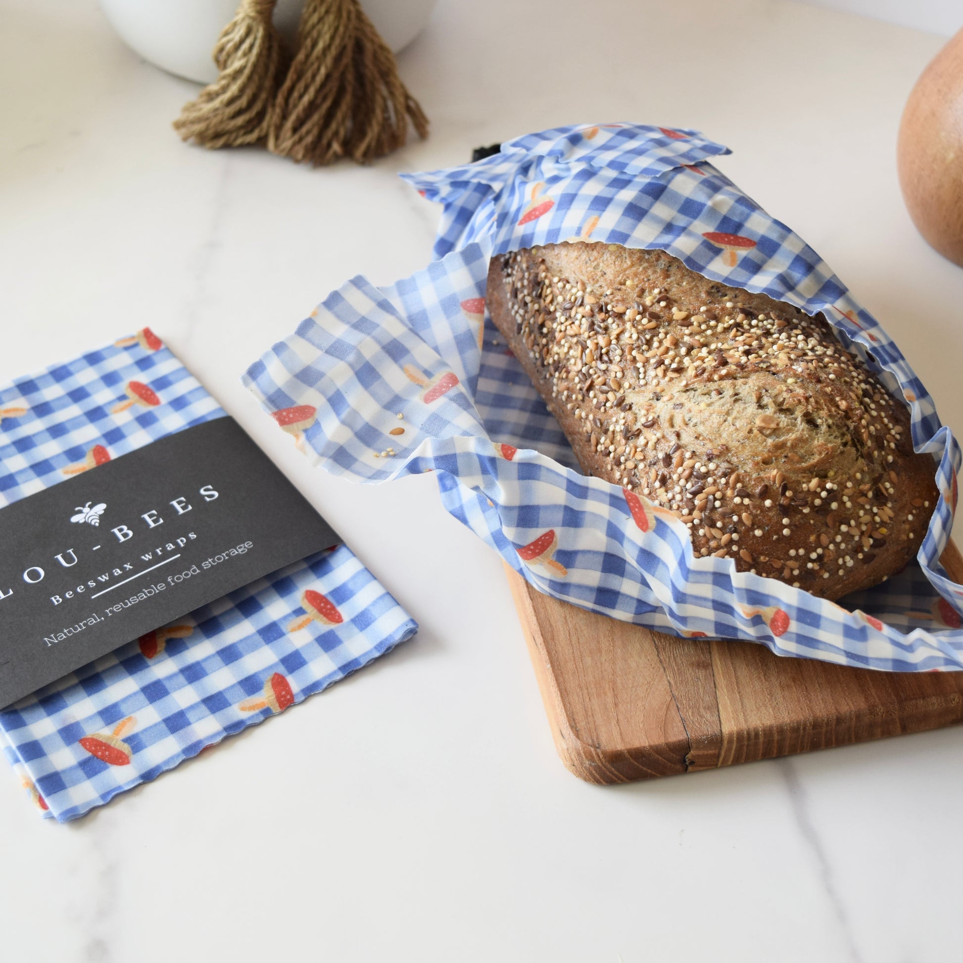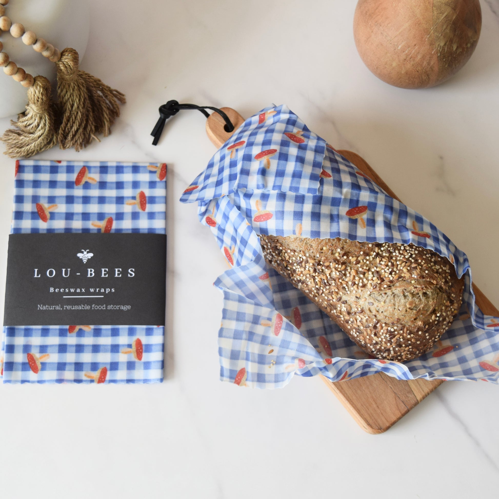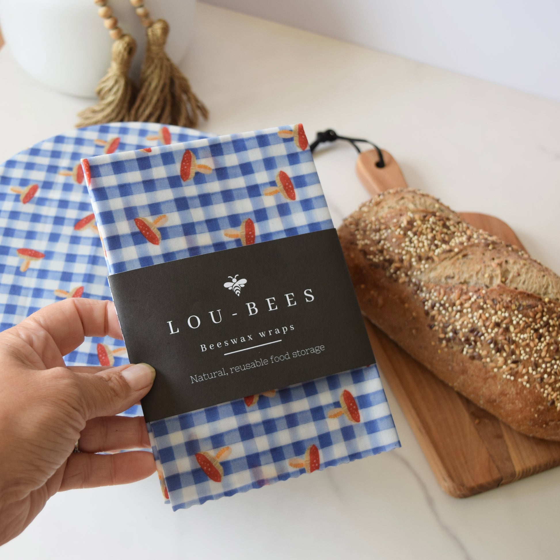 Toadstools on Gingham beeswax wrap — a delightful eco alternative to cling film that brings joy to every packed lunch or wrapped-up bake.
